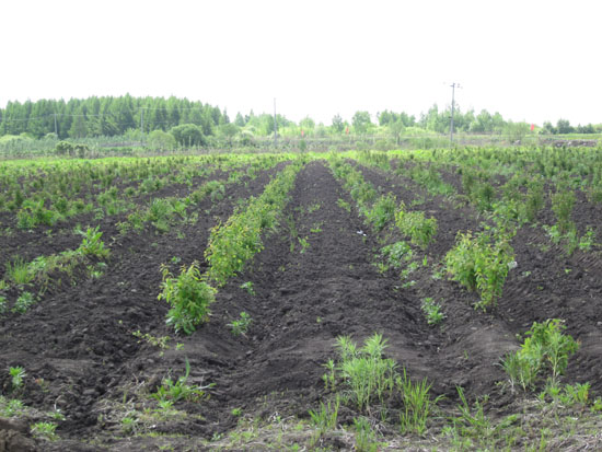 林场的小浆果基地占地面积32公顷,主要品种有蓝靛果忍冬、穗醋栗两大品种,蓝靛果忍冬现有从俄罗斯远东区引进的43个品种,穗醋栗8个品种。学名蓝靛果忍冬(Lonicera caerulea L. var. enulis Turcz et Herd),当地人又称它为羊奶子、黑瞎子果、山茄子果,穗醋栗当地人又称它为黑豆果。